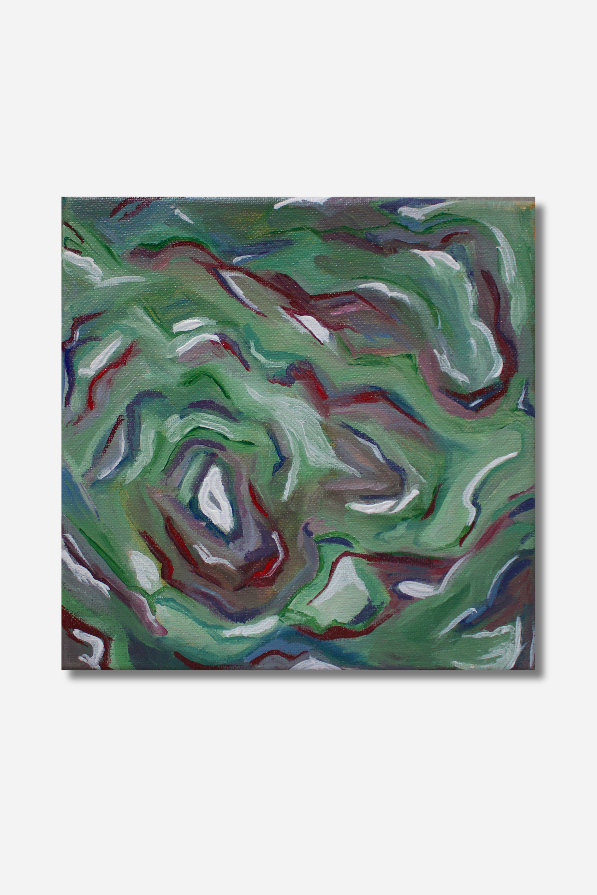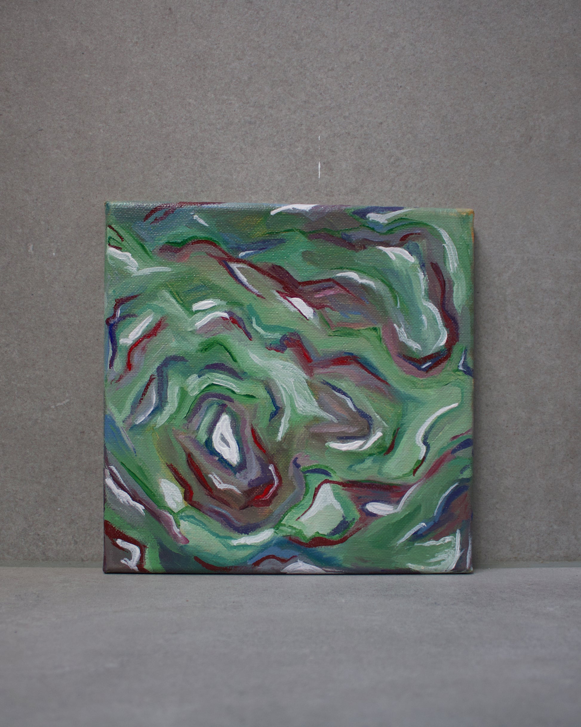 Antrum Viride – de "groene grot" – nodigt uit tot een verkenning van een mysterieuze, levendige wereld. In dit kleine, originele kunstwerk dansen diepe groentinten samen met accenten van paars en wit, als licht dat zich een weg baant door een verborgen, natuurlijke ruimte. Gelaagde penseelstreken creëren beweging en diepte, waardoor de stilte van de grot voelbaar wordt en tegelijkertijd energie en mysterie aanwezig blijven.