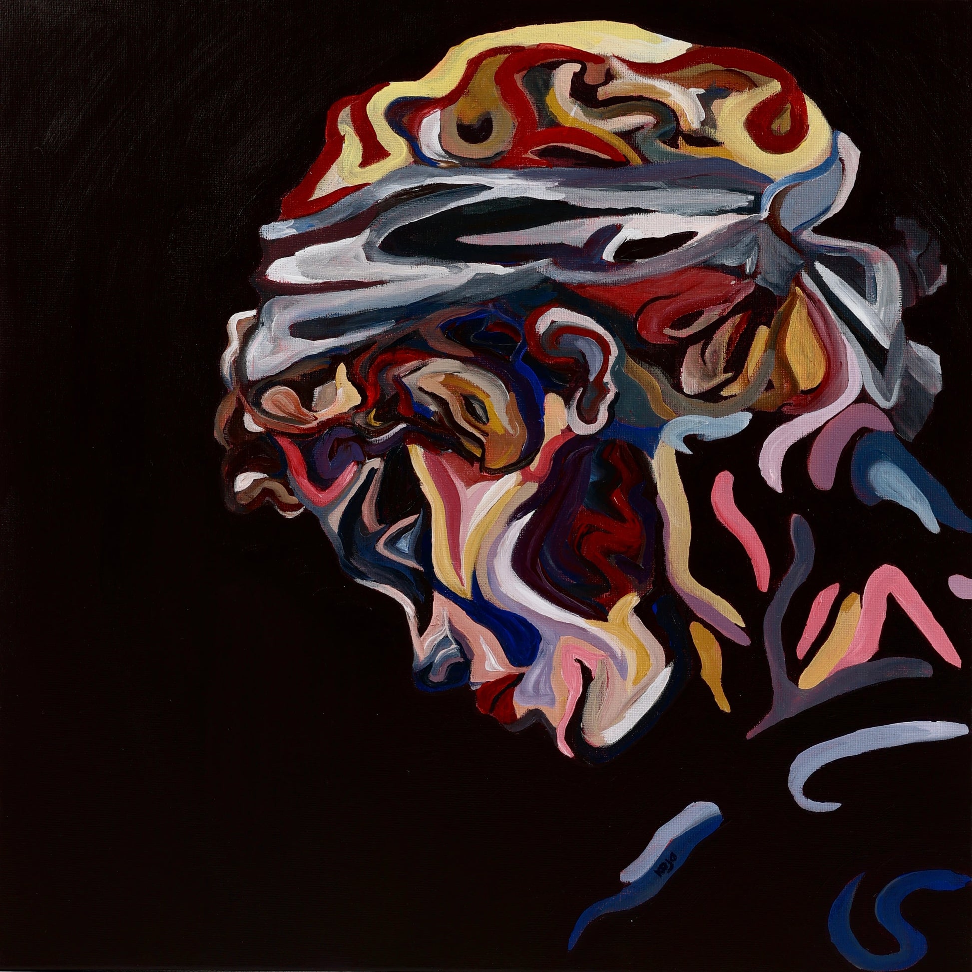 Een ode aan Apollo—god van licht, muziek en profetie. In dit abstracte portret vervaagt het goddelijke in kleur en breekt het beeld open in vormen vol emotie. Stilte wordt spanning, herinnering beweegt. De mythe ademt.